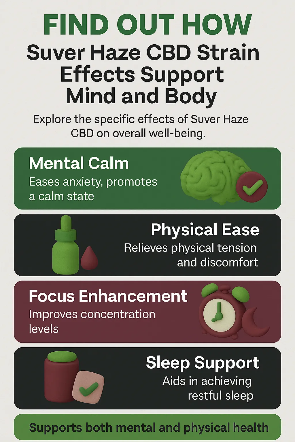 This page explains how Suver Haze CBD strain effects support both mind and body, from its distinctive terpene profile to the benefits consistently highlighted in user reports. By showcasing its unique balance of stress relief, relaxation, and clarity, along with insights into Suver haze CBD strain effects on sleep quality, readers will see why Suver Haze stands out as a trusted CBD strain for everyday wellness.