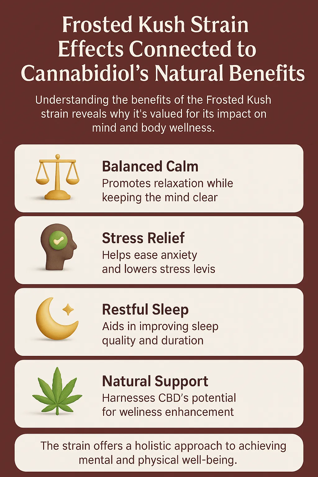 Many guides describe Frosted Kush strain effects with generic claims like “relaxing” or “good for sleep.” But Frosted Kush offers more—and that difference connects directly to cannabidiol’s natural benefits. Instead of heavy sedation or mental fog, this strain delivers what users consistently report: a calm body paired with a clear, balanced mind.